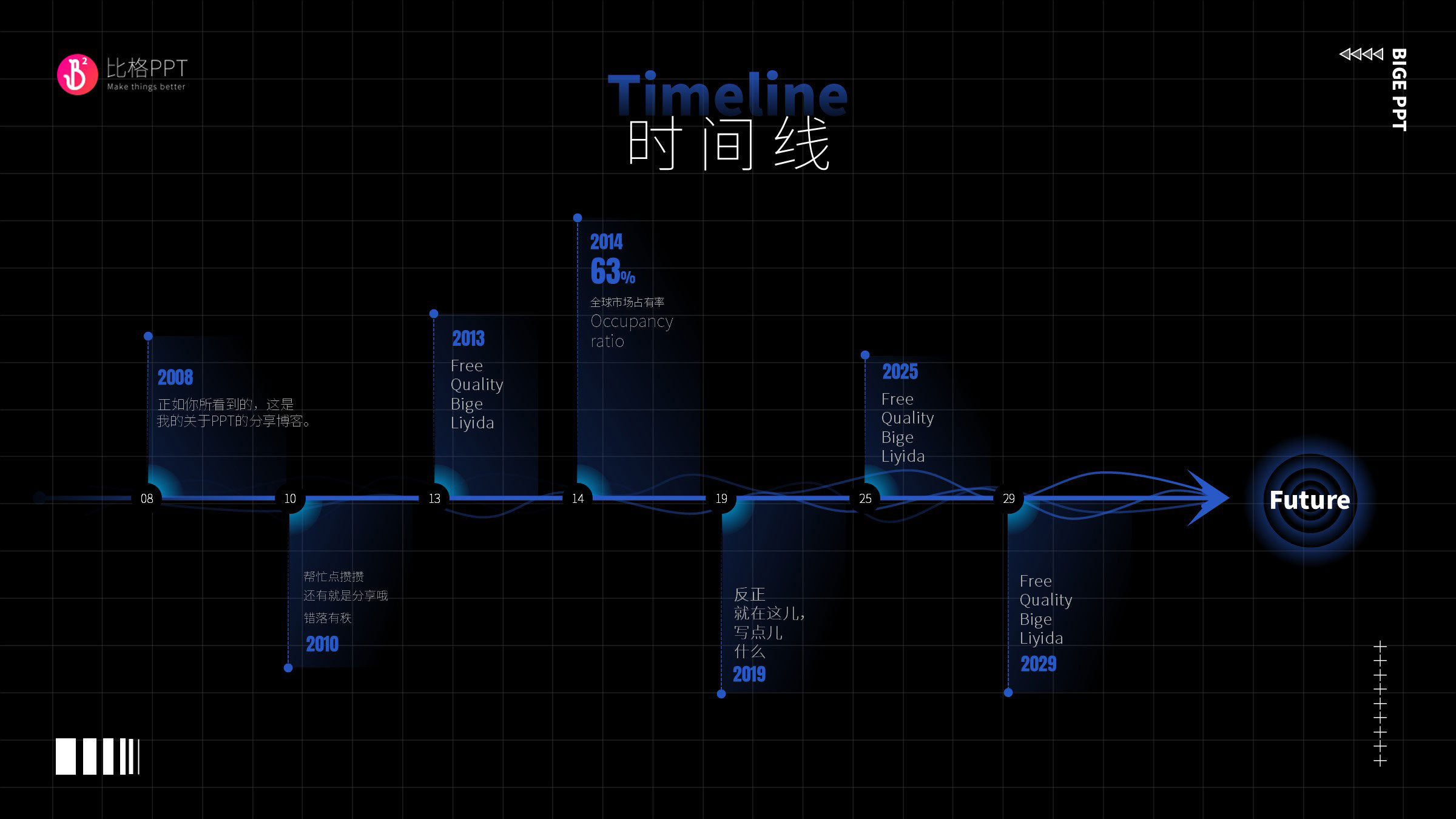 5、使用這種模板想要好看,關鍵的地方在于各個節點內容體積(內容多少)的高低和疏密,內容多,自然就可以把文本框撐的高一點;如果內容不夠做出這種高低疏密之分,可以手動拉長虛線的高度,人為制造高低差。這樣做的話,會打破板塊與板塊之間過于相似的呆板和無趣,同時高出的內容也得到了強調。